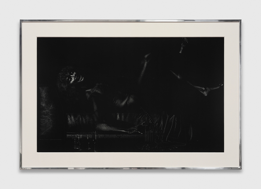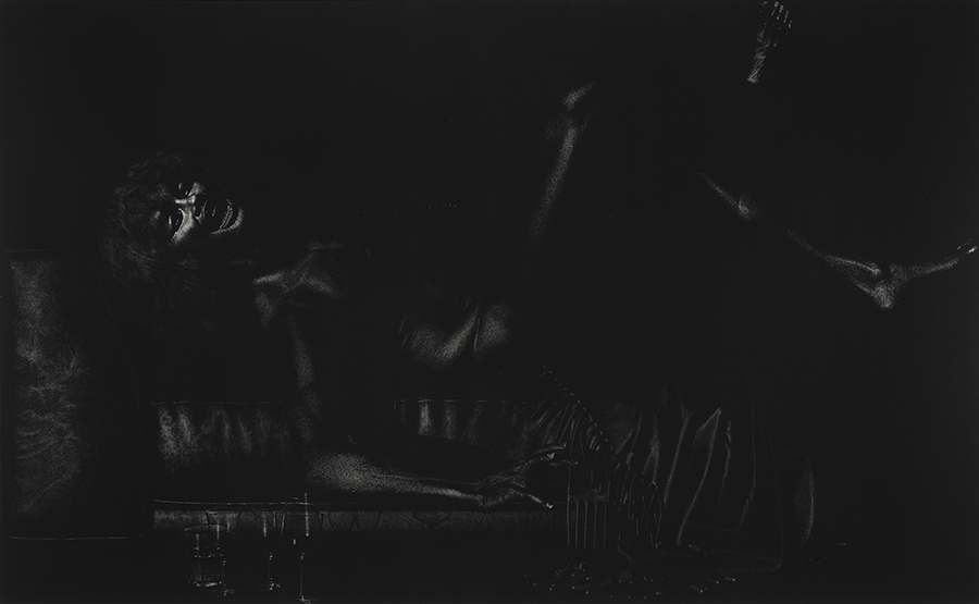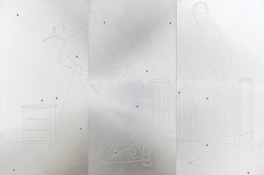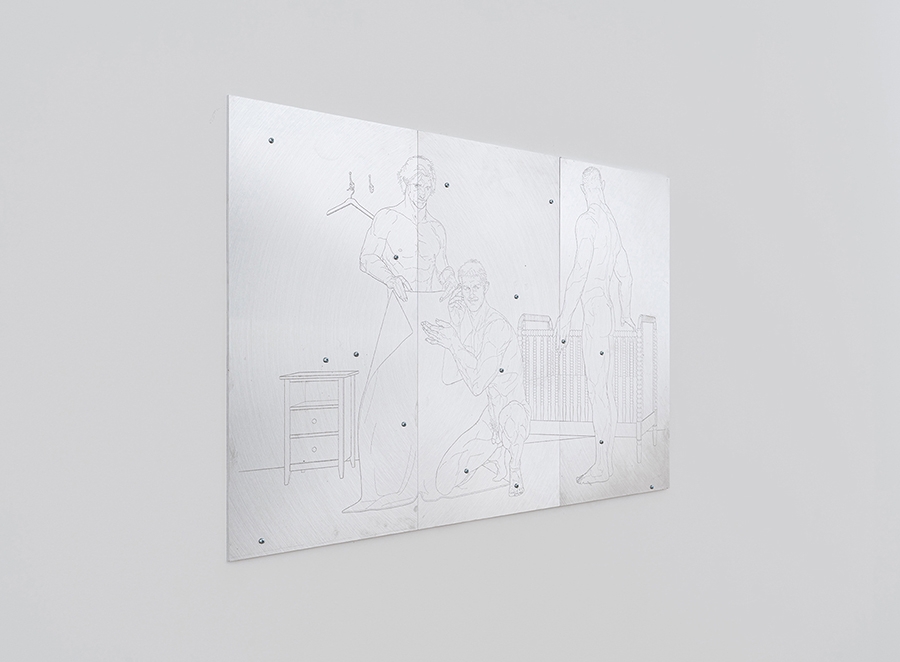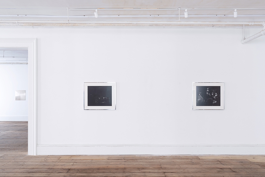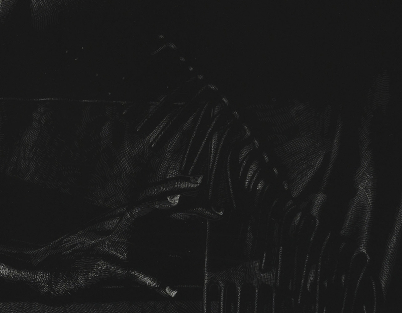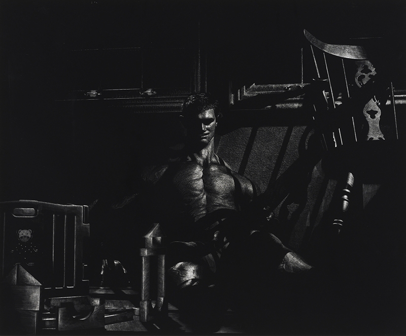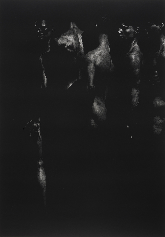 Installed throughout the gallery are ten of the artist's recent photograms depicting entirely invented scenes of nude men in shadowy and ambiguous tableaux. Hill’s photograms are cameraless photographic prints created by exposing light-sensitive paper through the sieve of a hand-made negative. Drawn on acetate, variously dense networks of line filter light to yield highlights and halftones, while all unmarked space registers in the final print as a rich and uniform black ground. With this technique, keyed exclusively to the rendering of light and shadow, Hill departs from the linear style of his lithographic works to probe the deep virtual space of photographic chiaroscuro and its unique possibilities for occlusion and disfigurement.