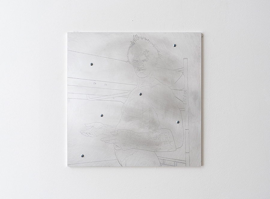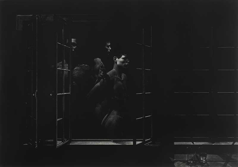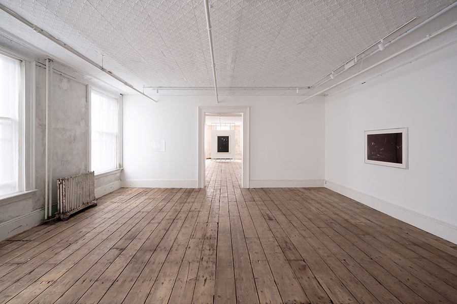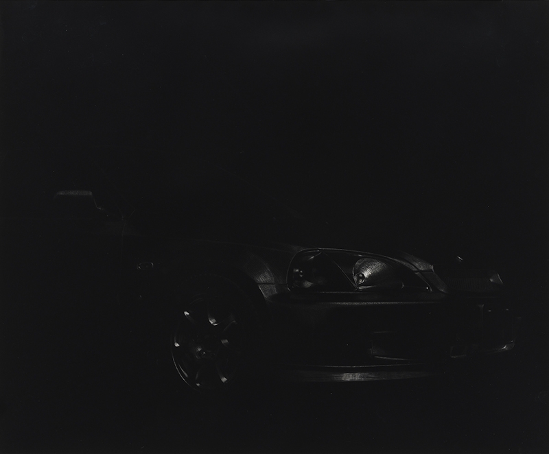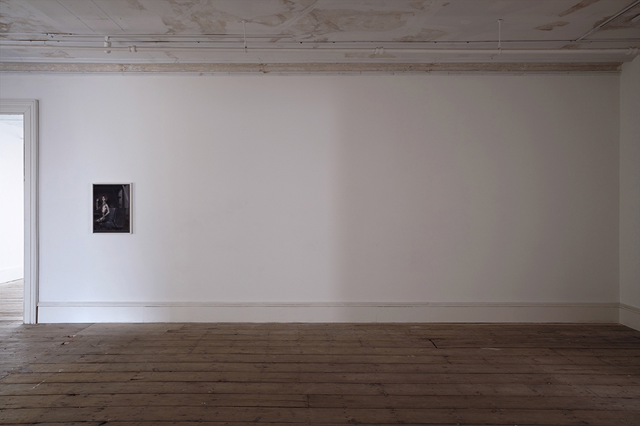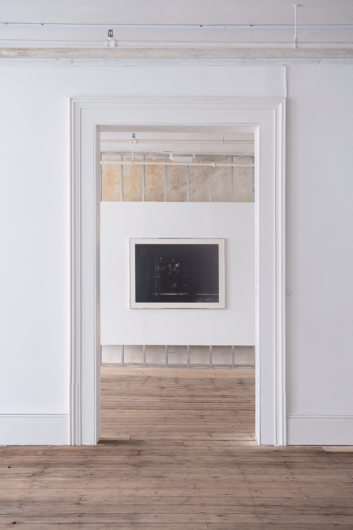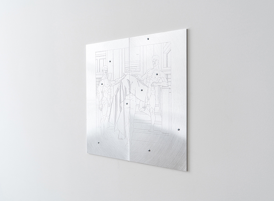 Installed throughout the gallery are ten of the artist's recent photograms depicting entirely invented scenes of nude men in shadowy and ambiguous tableaux. Hill’s photograms are cameraless photographic prints created by exposing light-sensitive paper through the sieve of a hand-made negative. Drawn on acetate, variously dense networks of line filter light to yield highlights and halftones, while all unmarked space registers in the final print as a rich and uniform black ground. With this technique, keyed exclusively to the rendering of light and shadow, Hill departs from the linear style of his lithographic works to probe the deep virtual space of photographic chiaroscuro and its unique possibilities for occlusion and disfigurement.