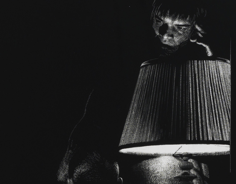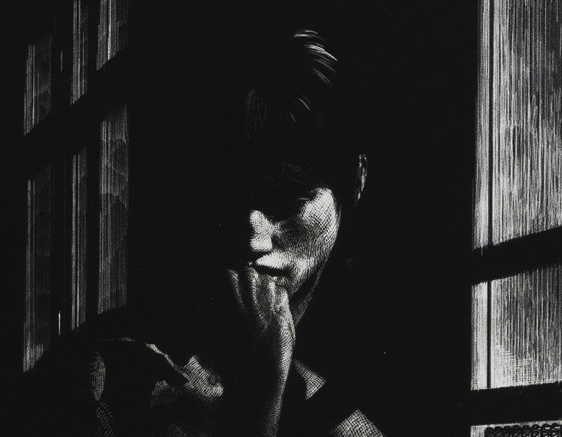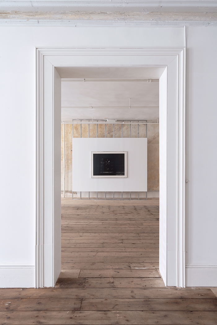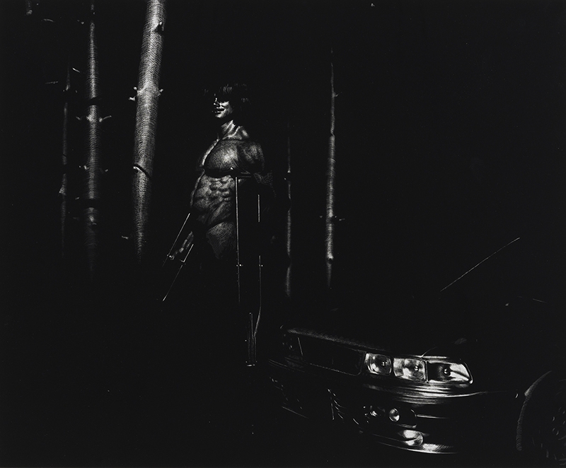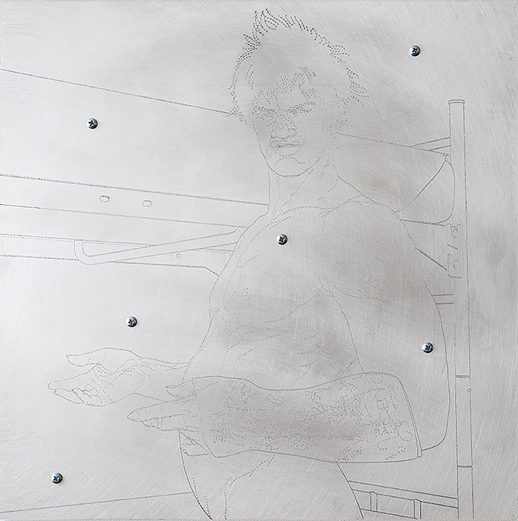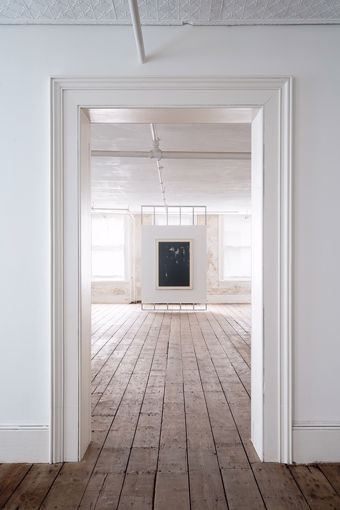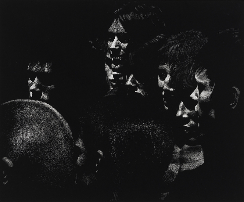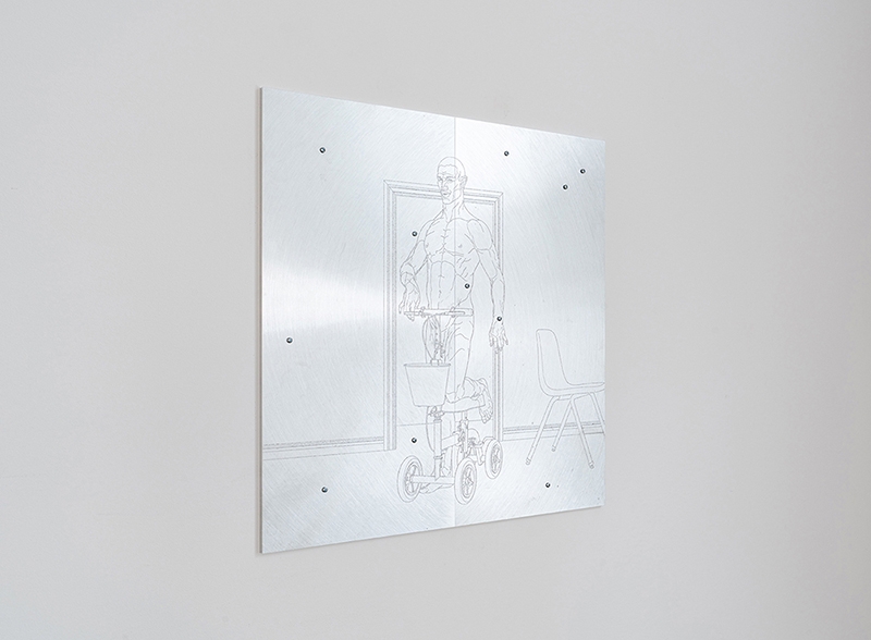 Installed throughout the gallery are ten of the artist's recent photograms depicting entirely invented scenes of nude men in shadowy and ambiguous tableaux. Hill’s photograms are cameraless photographic prints created by exposing light-sensitive paper through the sieve of a hand-made negative. Drawn on acetate, variously dense networks of line filter light to yield highlights and halftones, while all unmarked space registers in the final print as a rich and uniform black ground. With this technique, keyed exclusively to the rendering of light and shadow, Hill departs from the linear style of his lithographic works to probe the deep virtual space of photographic chiaroscuro and its unique possibilities for occlusion and disfigurement.