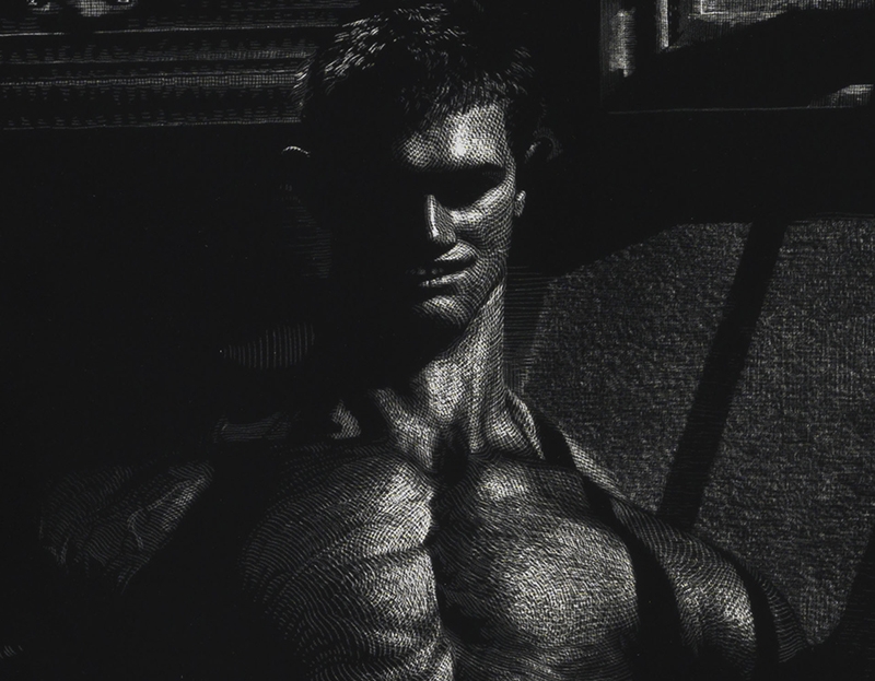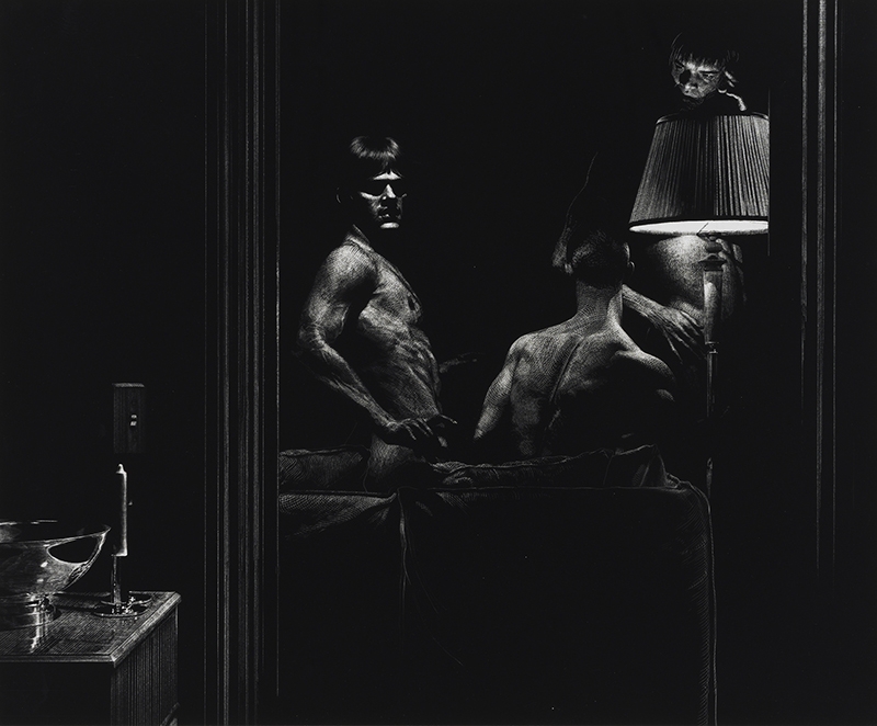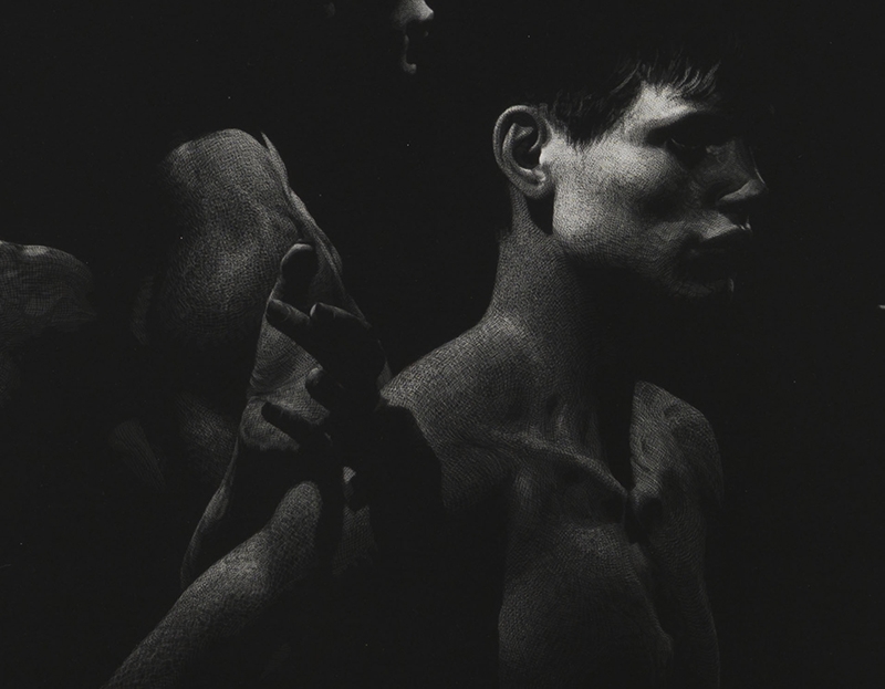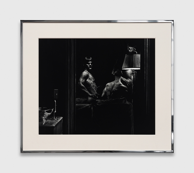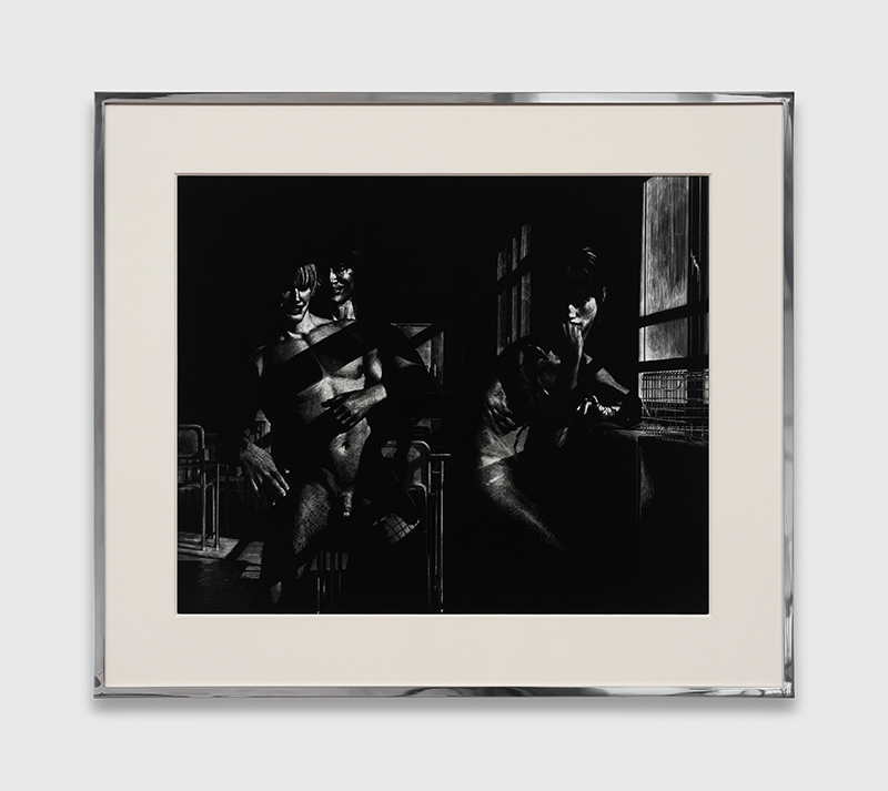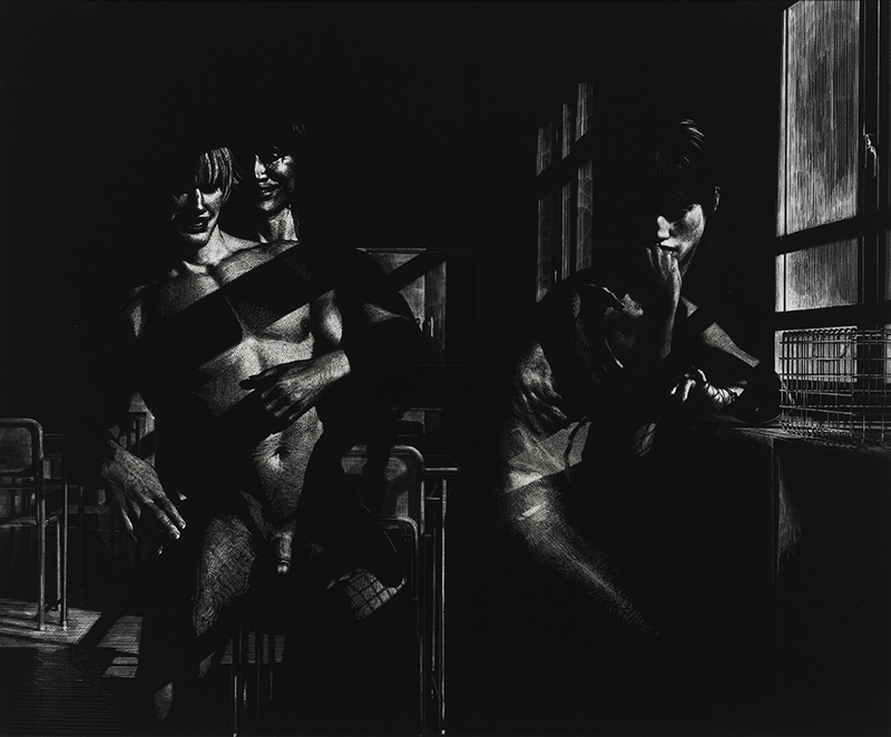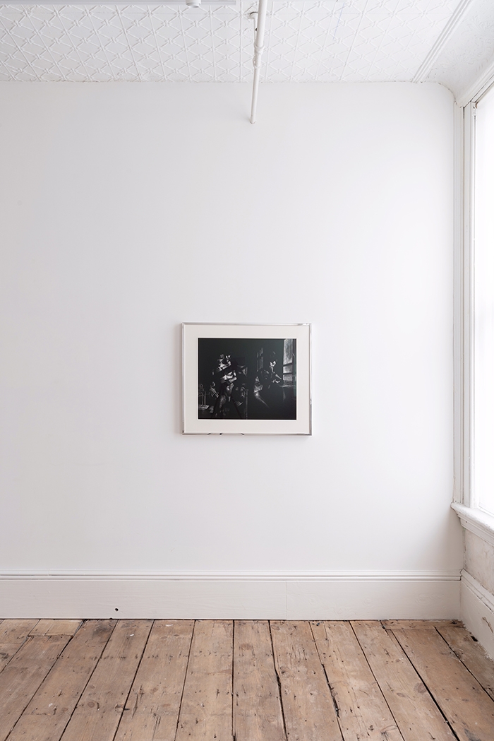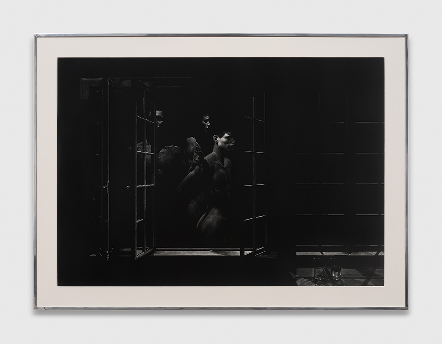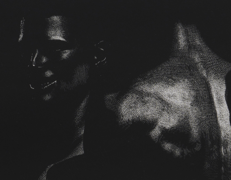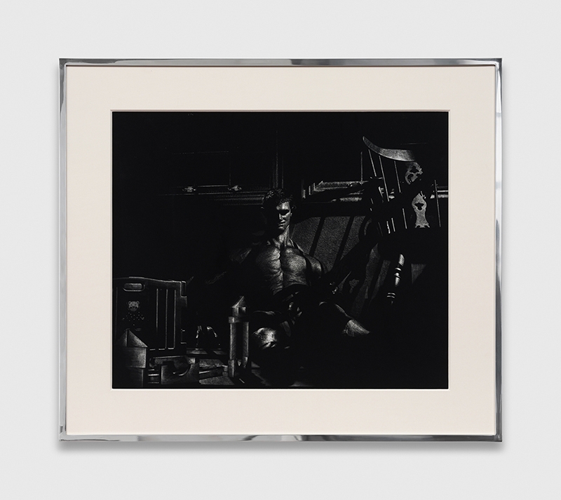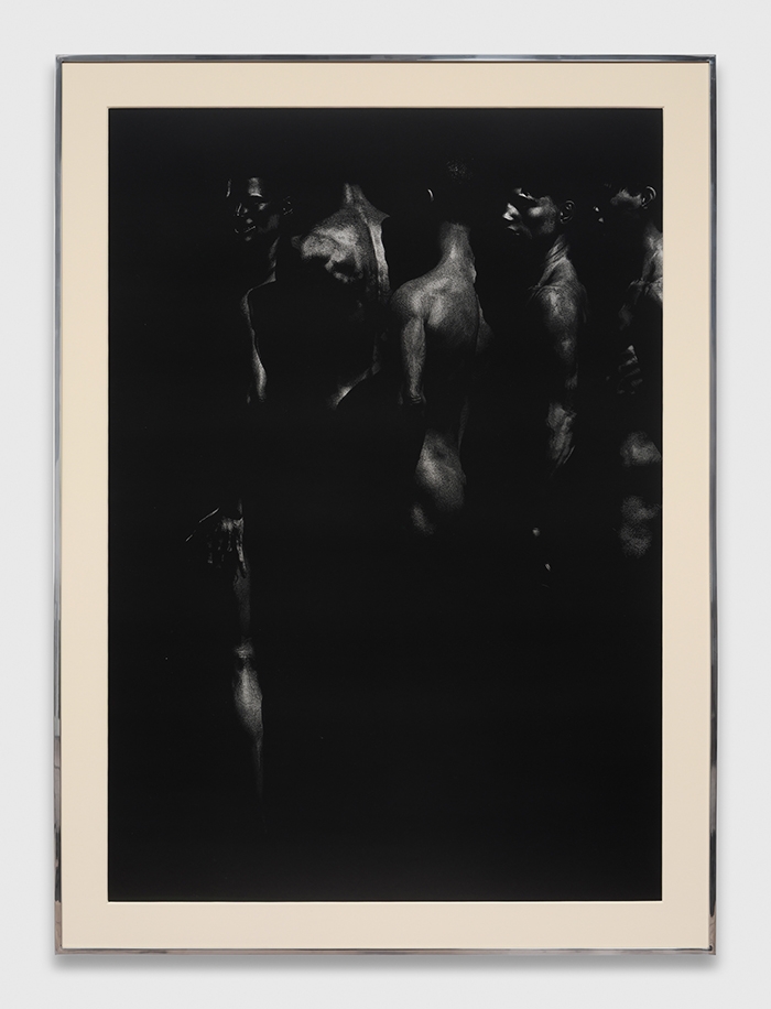 Installed throughout the gallery are ten of the artist's recent photograms depicting entirely invented scenes of nude men in shadowy and ambiguous tableaux. Hill’s photograms are cameraless photographic prints created by exposing light-sensitive paper through the sieve of a hand-made negative. Drawn on acetate, variously dense networks of line filter light to yield highlights and halftones, while all unmarked space registers in the final print as a rich and uniform black ground. With this technique, keyed exclusively to the rendering of light and shadow, Hill departs from the linear style of his lithographic works to probe the deep virtual space of photographic chiaroscuro and its unique possibilities for occlusion and disfigurement.