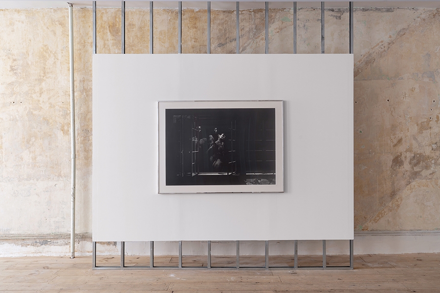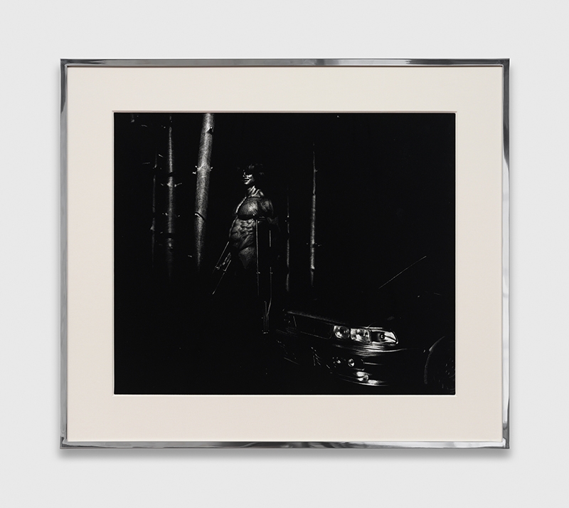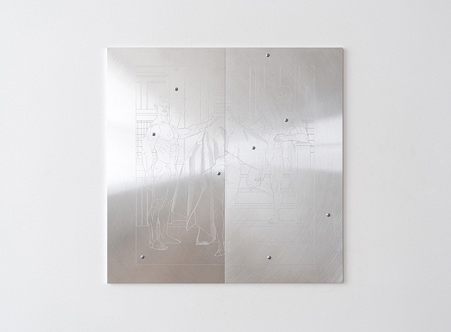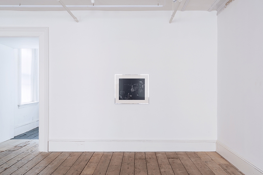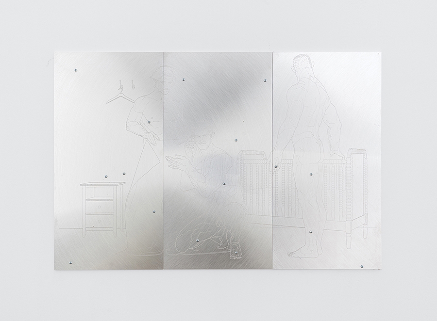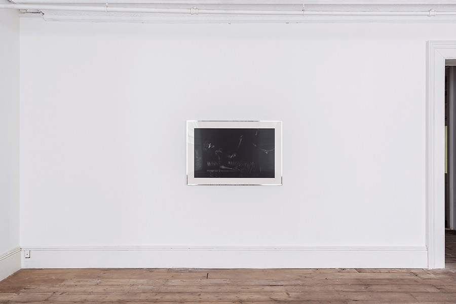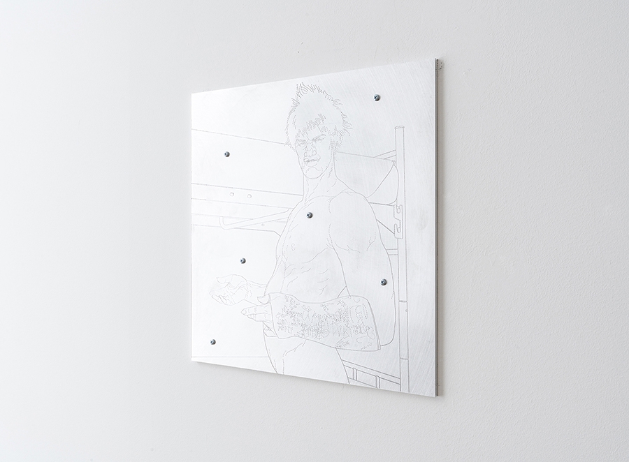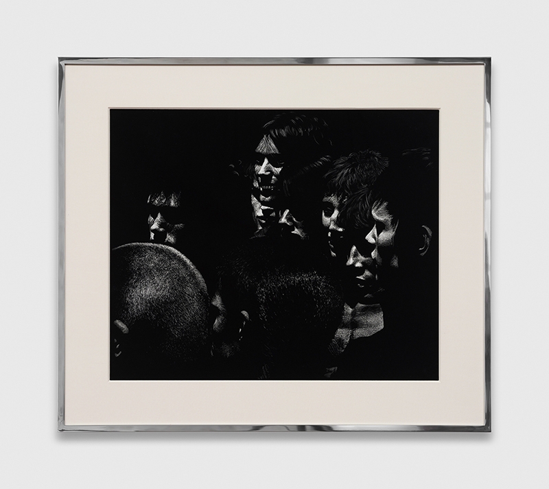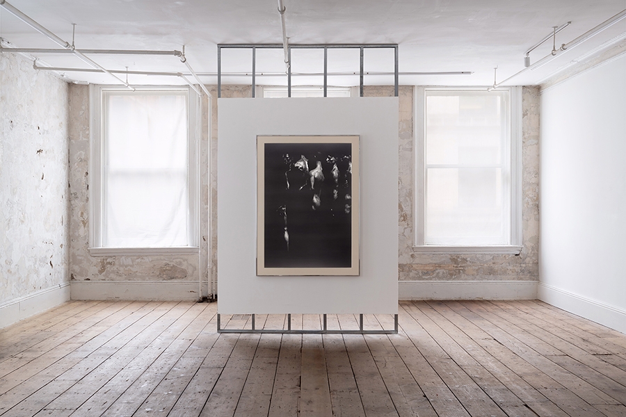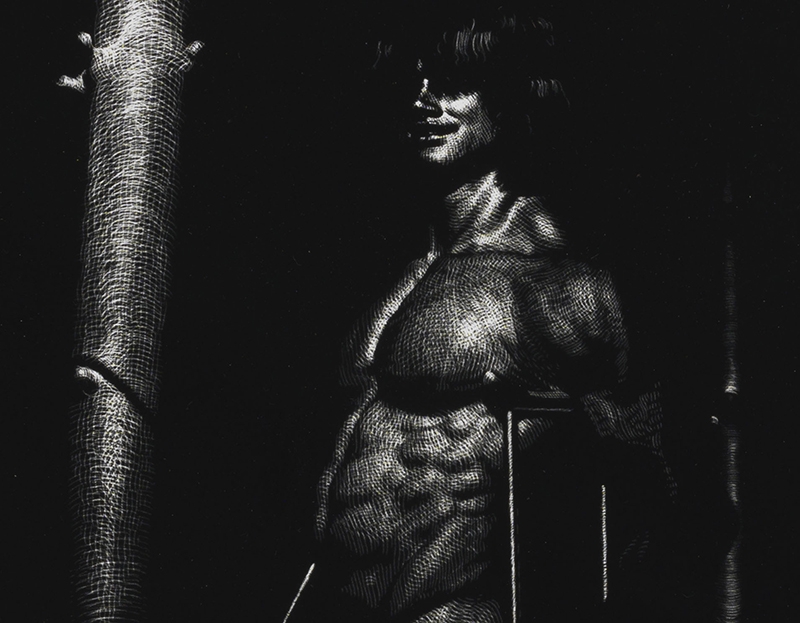 Installed throughout the gallery are ten of the artist's recent photograms depicting entirely invented scenes of nude men in shadowy and ambiguous tableaux. Hill’s photograms are cameraless photographic prints created by exposing light-sensitive paper through the sieve of a hand-made negative. Drawn on acetate, variously dense networks of line filter light to yield highlights and halftones, while all unmarked space registers in the final print as a rich and uniform black ground. With this technique, keyed exclusively to the rendering of light and shadow, Hill departs from the linear style of his lithographic works to probe the deep virtual space of photographic chiaroscuro and its unique possibilities for occlusion and disfigurement.