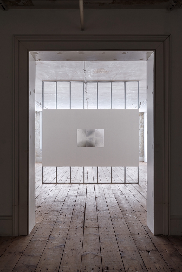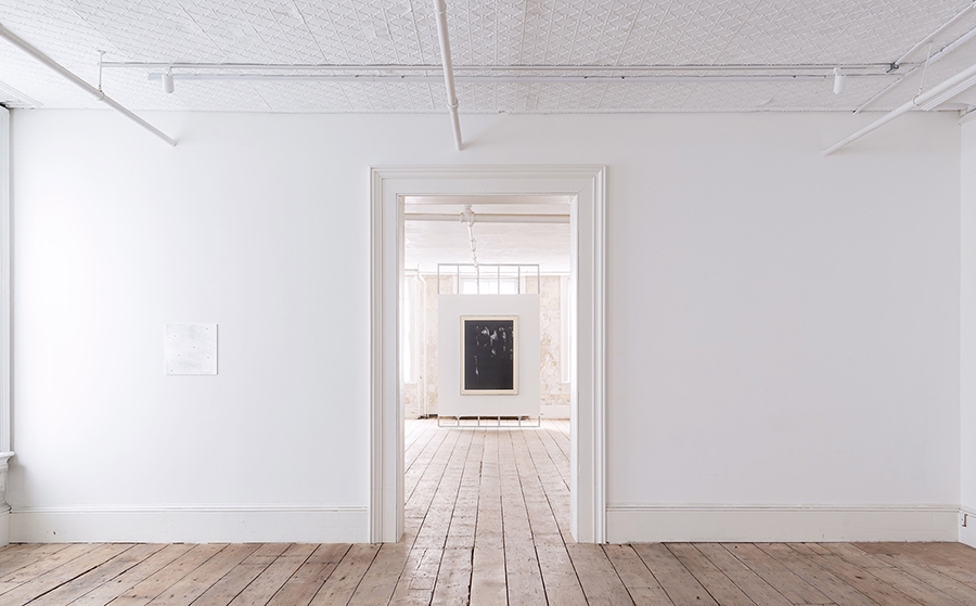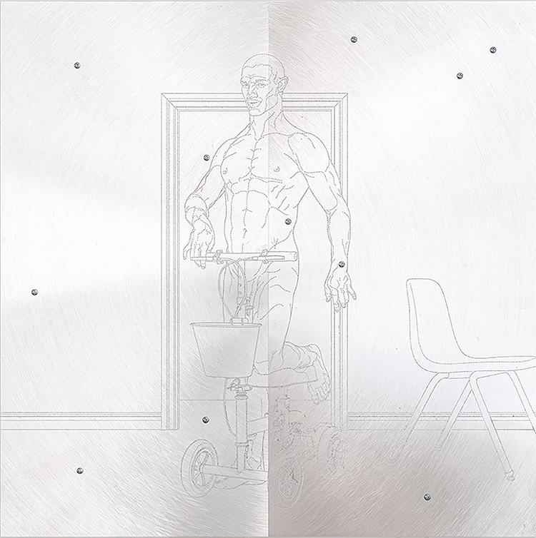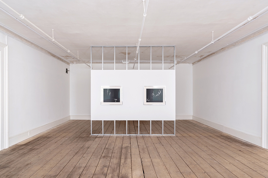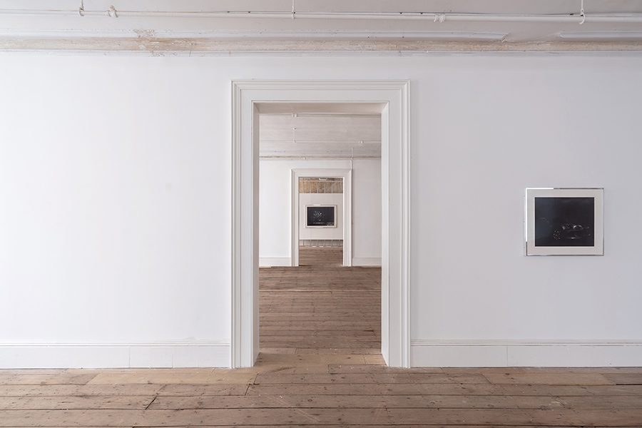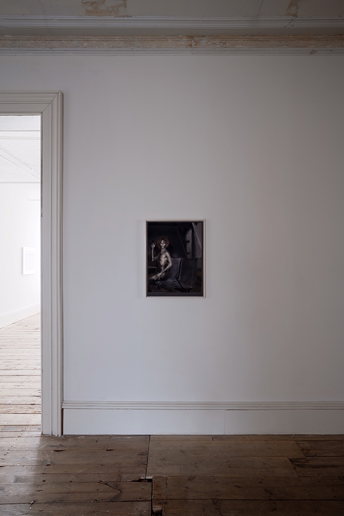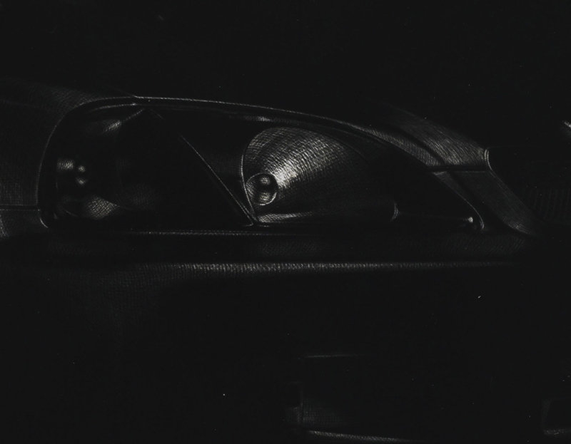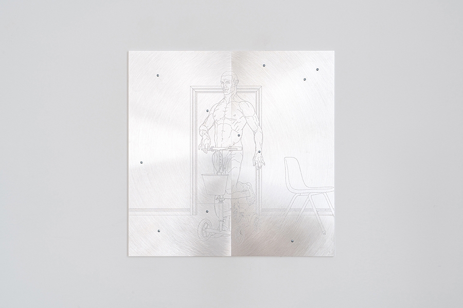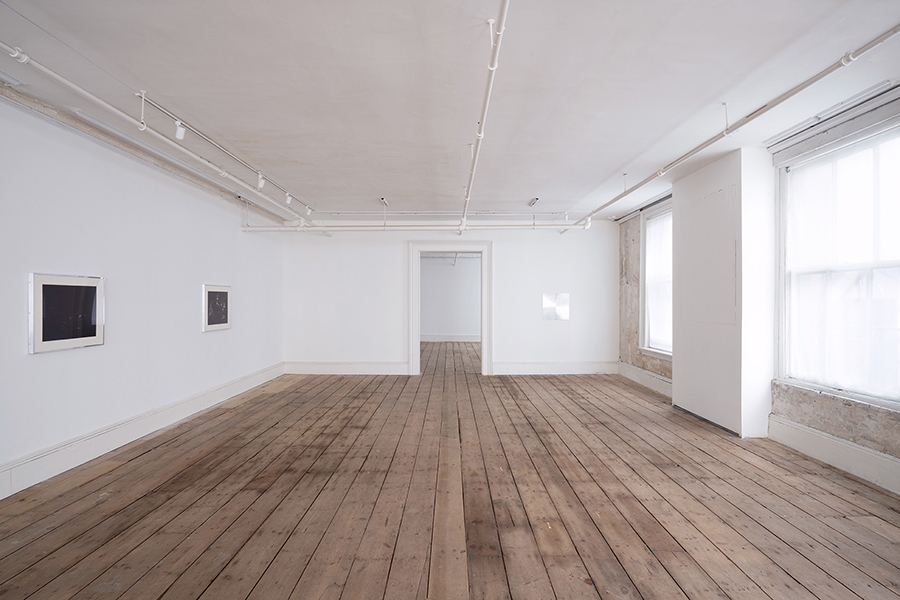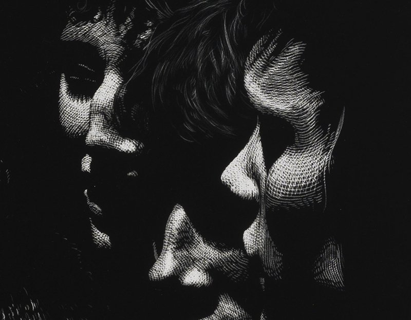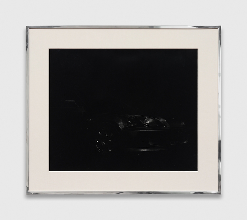 Installed throughout the gallery are ten of the artist's recent photograms depicting entirely invented scenes of nude men in shadowy and ambiguous tableaux. Hill’s photograms are cameraless photographic prints created by exposing light-sensitive paper through the sieve of a hand-made negative. Drawn on acetate, variously dense networks of line filter light to yield highlights and halftones, while all unmarked space registers in the final print as a rich and uniform black ground. With this technique, keyed exclusively to the rendering of light and shadow, Hill departs from the linear style of his lithographic works to probe the deep virtual space of photographic chiaroscuro and its unique possibilities for occlusion and disfigurement.